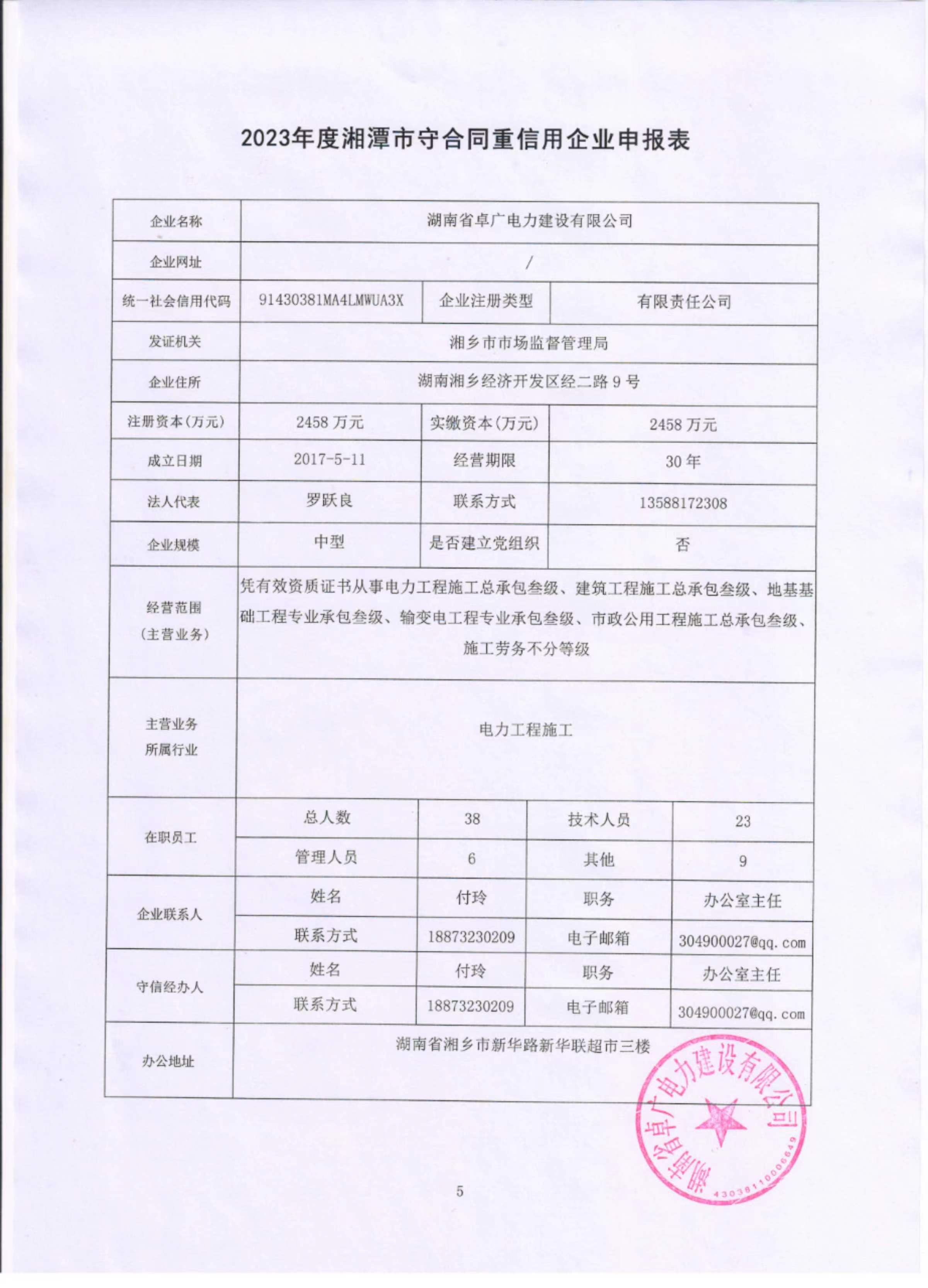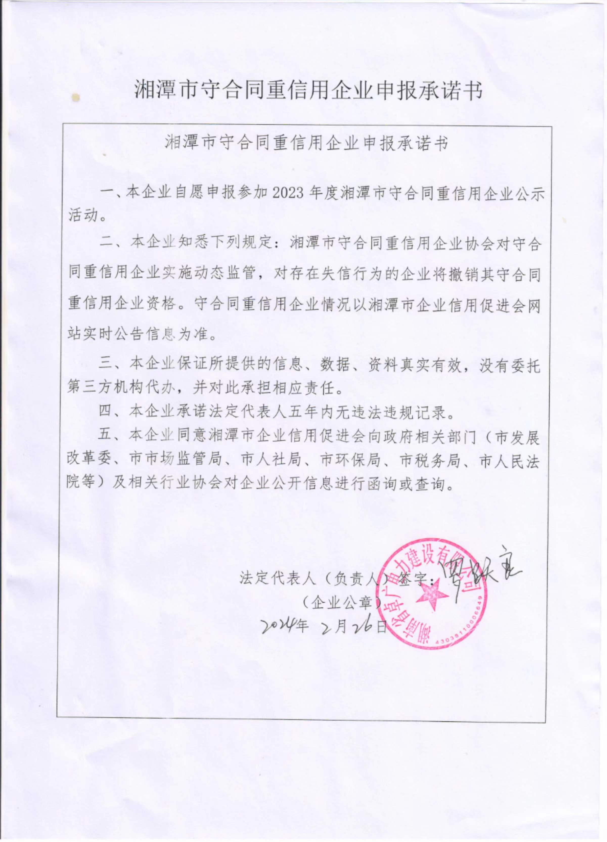 本企業(yè)根據(jù)《湘潭市守合同重信用企業(yè)申報規(guī)定》等編制 2023 年度企業(yè)信用報告書,并保證本報告書內(nèi)容真實、準確、完整。