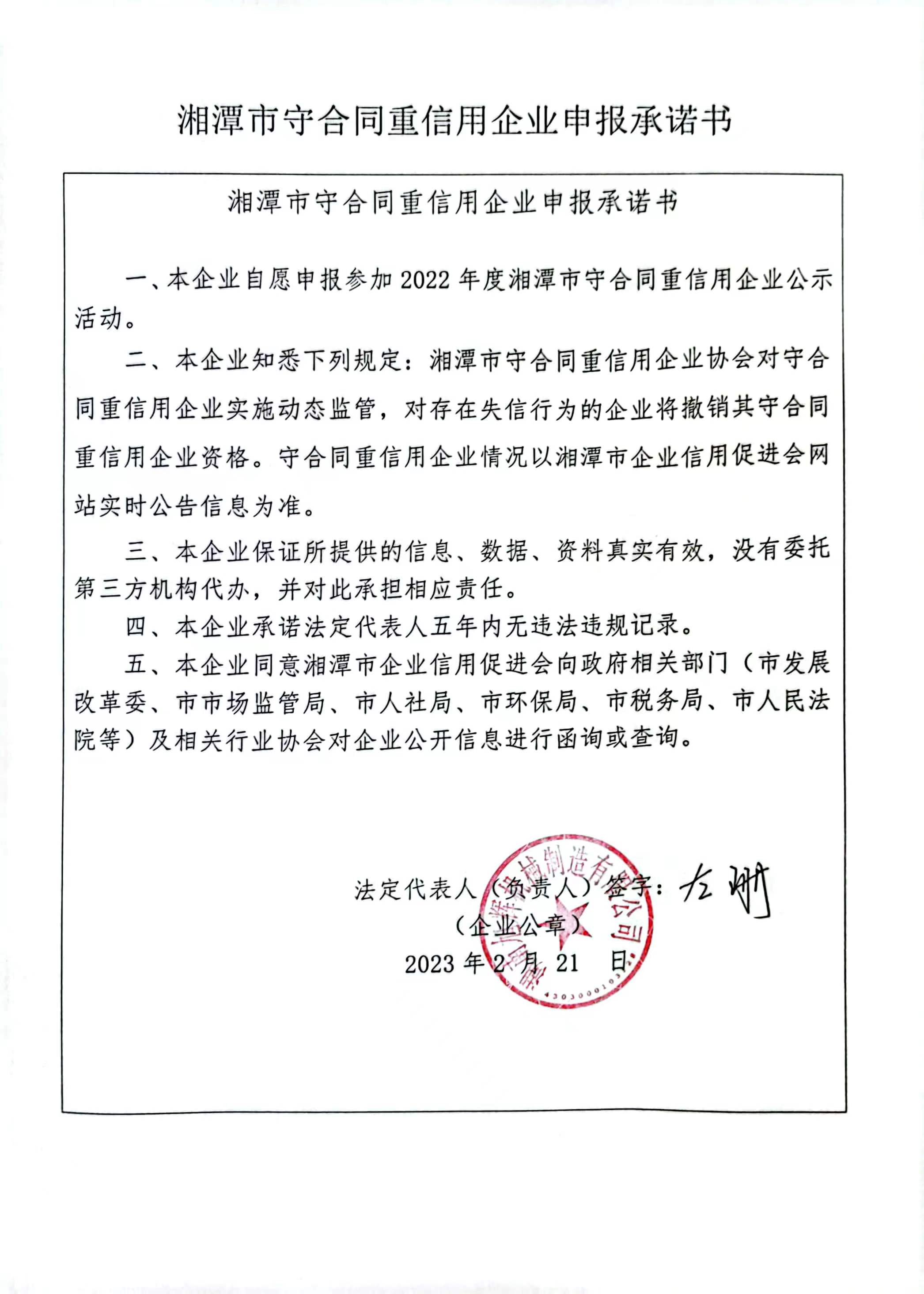 本企業(yè)根據(jù)《湘潭市守合同重信用企業(yè)申報規(guī)定》等編制 2022 年度企業(yè)信用報告書,并保證本報告書內(nèi)容真實、準(zhǔn)確、完整。