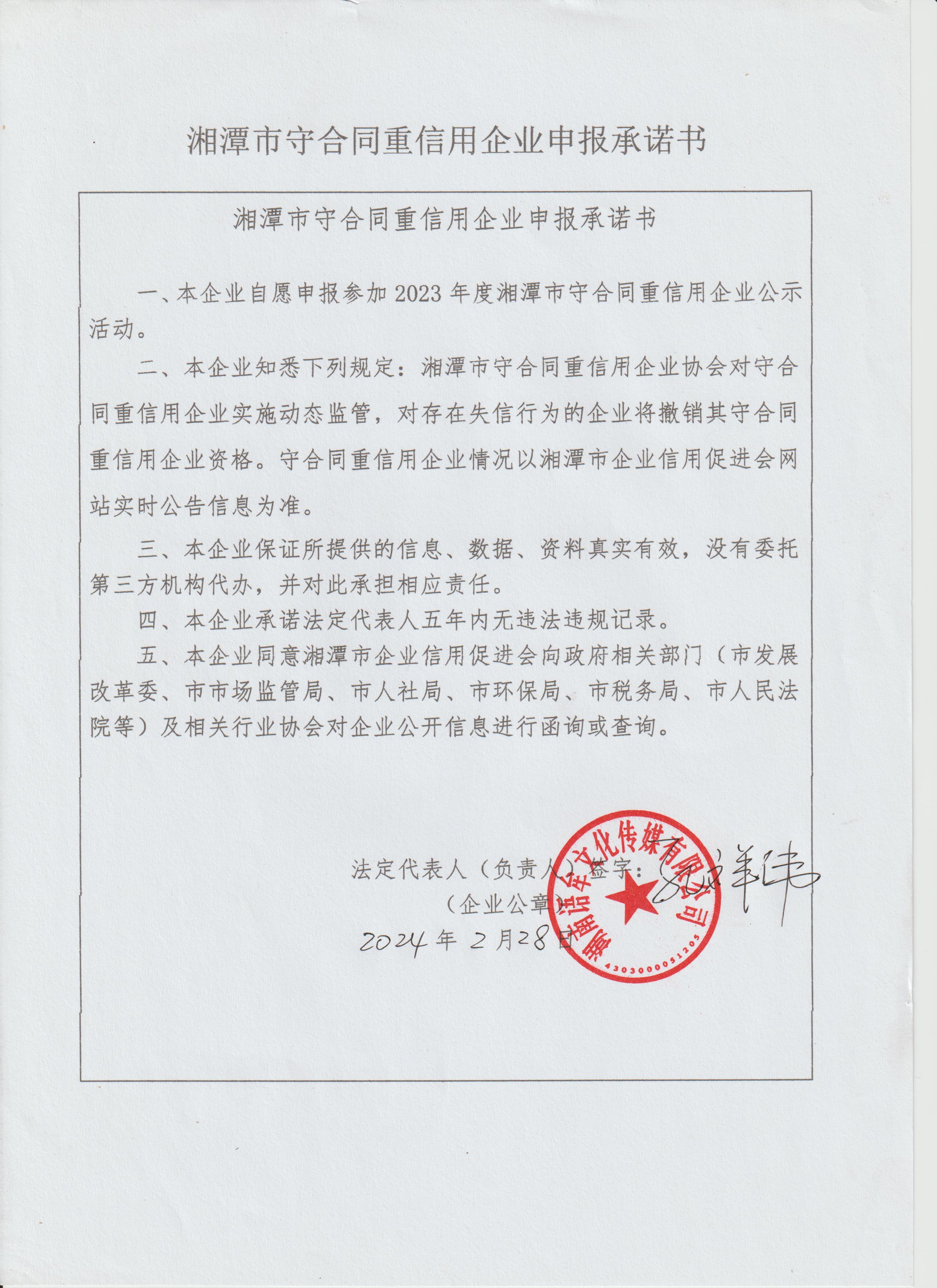 本企業(yè)根據(jù)《湘潭市守合同重信用企業(yè)申報規(guī)定》等編制 2023 年度企業(yè)信用報告書,并保證本報告書內(nèi)容真實、準確、完整。