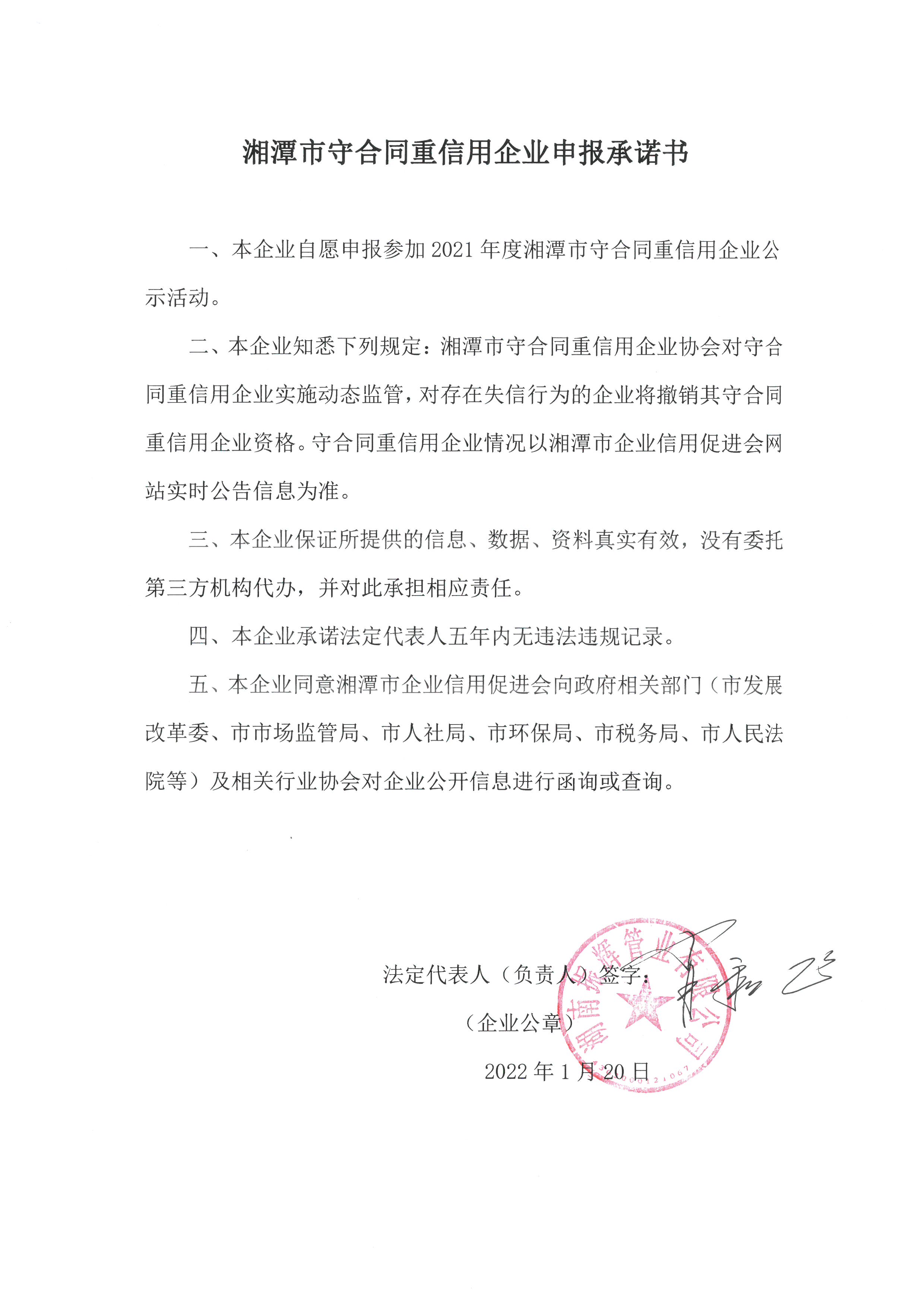 本企業(yè)根據(jù)《湘潭市守合同重信用企業(yè)申報(bào)規(guī)定》等編制 2021 年度企業(yè)信用報(bào)告書,并保證本報(bào)告書內(nèi)容真實(shí)、準(zhǔn)確、完整。