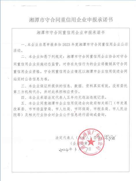 本企業(yè)根據(jù)《湘潭市守合同重信用企業(yè)申報(bào)規(guī)定》等編制 2023 年度企業(yè)信用報(bào)告書,并保證本報(bào)告書內(nèi)容真實(shí)、準(zhǔn)確、完整。