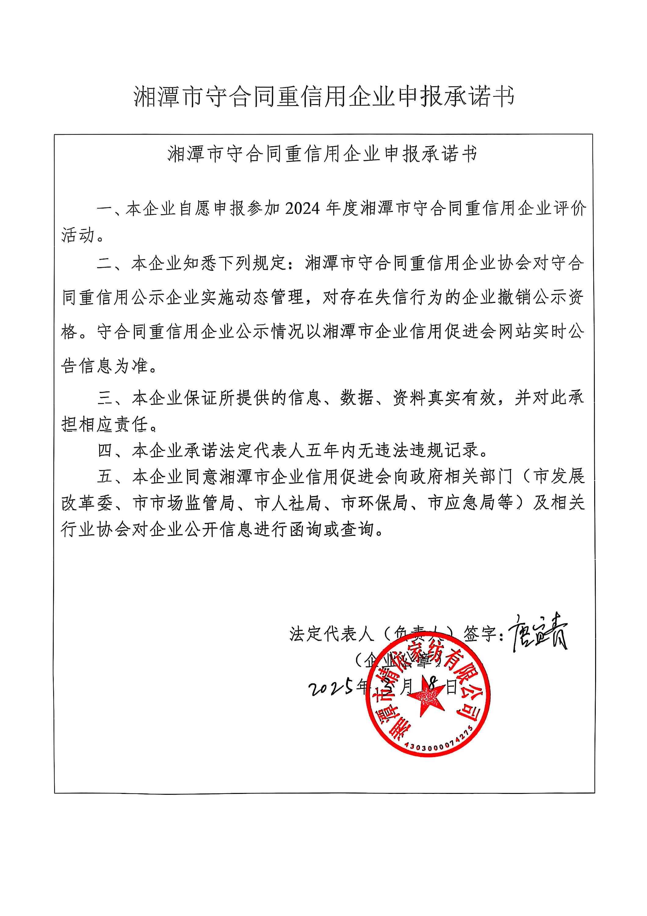 本企業(yè)根據(jù)《湘潭市守合同重信用企業(yè)申報規(guī)定》等編制 2024 年度企業(yè)信用報告書,并保證本報告書內(nèi)容真實、準(zhǔn)確、完整。