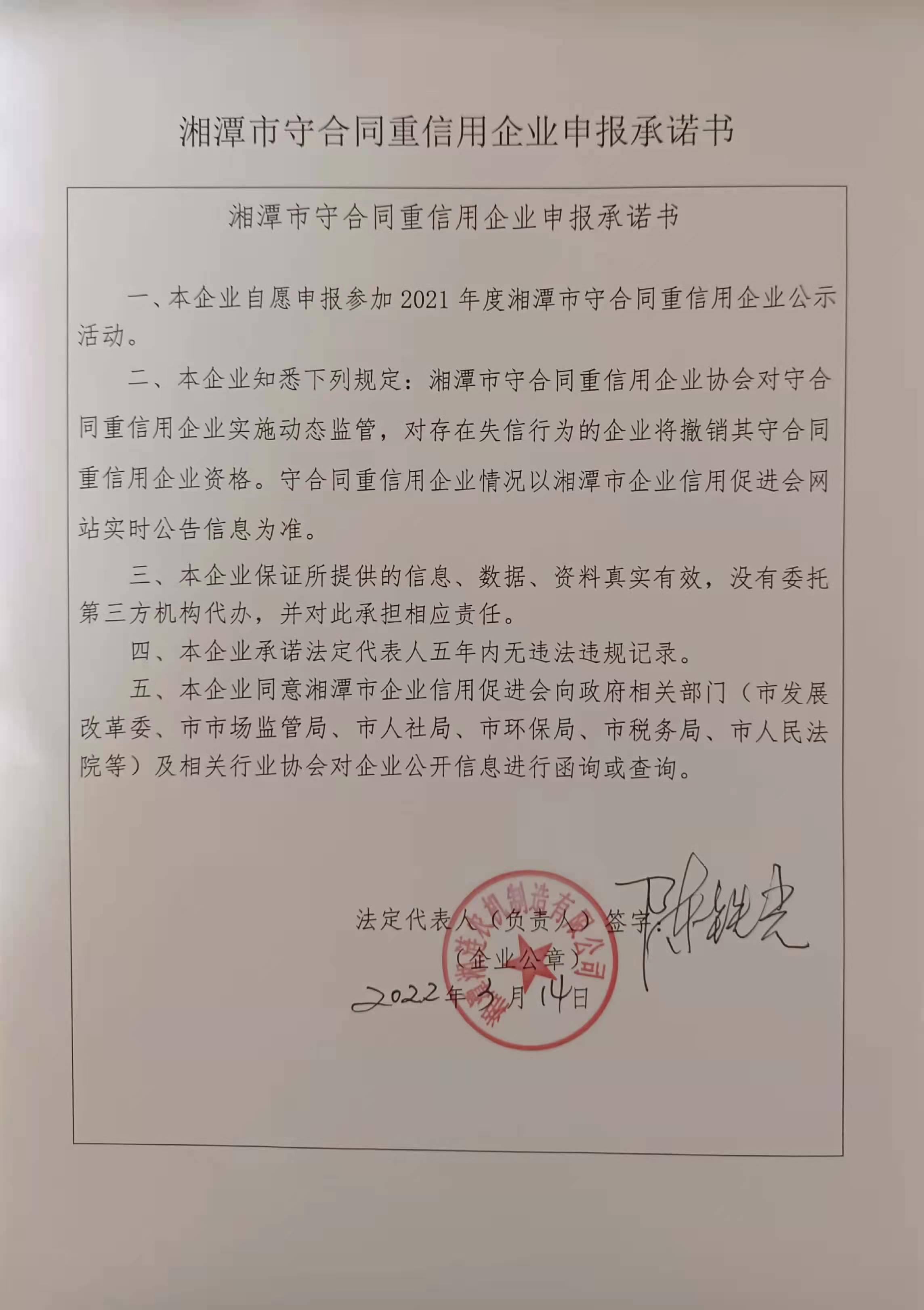 本企業(yè)根據(jù)《湘潭市守合同重信用企業(yè)申報規(guī)定》等編制 2021 年度企業(yè)信用報告書,并保證本報告書內(nèi)容真實、準(zhǔn)確、完整。